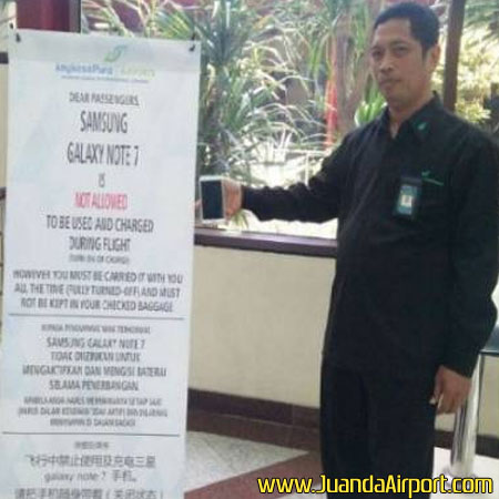 “Instruksinya dijalankan yakni penyelenggara Bandar Udara diinstrusikan untuk memastikan penumpang dan personel pesawat udara tidak menempatkan baterai lithium, power bank, dan smartphone Samsung Galaxy Note 7 dalam bagasi penerbangan (checked baggage),” ujar General Manager Bandar Udara Internasional Juanda, Yuwono, Rabu (14/9).