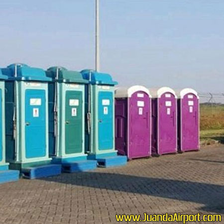 Surabaya – Pihak PT Angkasa Pura (AP) I selaku pengelola Bandara Internasional Juanda menyediakan fasilitas berupa belasan unit toilet portable untuk memenuhi kebutuhan para calon jemaah haji embarkasi Surabaya pada Rabu (26/7). Toilet-toilet portabel tersebut diletakkan di airside Bandara Juanda, tidak terlalu jauh dari lokasi parkir bus.