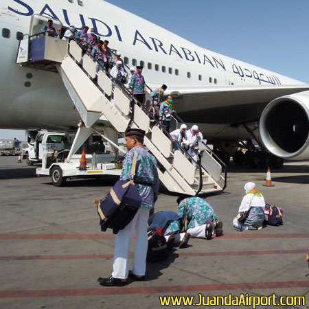 Surabaya – Pesawat Saudi Arabia Airlines yang menampung 443 jemaah haji kelompok terbang (kloter) pertama Jawa Timur asal Kabupaten Kediri akhirnya mendarat di Bandara Internasional Juanda pada Kamis (7/9) lalu pukul 15.50 WIB. Sementara itu proses pemulangan jemaah haji sendiri telah memasuki hari ketiga pada Jumat (8/9). Total ada 19 kloter yang akan dipulangkan dari bandara Jeddah ke sejumlah embarkasi di Indonesia.