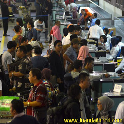 Calon penumpang tampak mengantre sejak dari pintu masuk keberangkatan hingga loket check in bandara. Karena adanya lonjakan jumlah penumpang, ruang tunggu bandara di luar pintu keberangkatan dan ruang tunggu check in maupun tempat boarding pesawat tak sanggup menampung para penumpang.