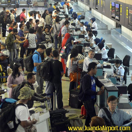 Arus penumpang di Bandara Juanda, terutama untuk penerbangan domestik, terus meningkat jika dibandingkan periode yang sama tahun lalu. Hingga Rabu (29/6) dini hari, total penumpang sudah mencapai 53.339 orang.